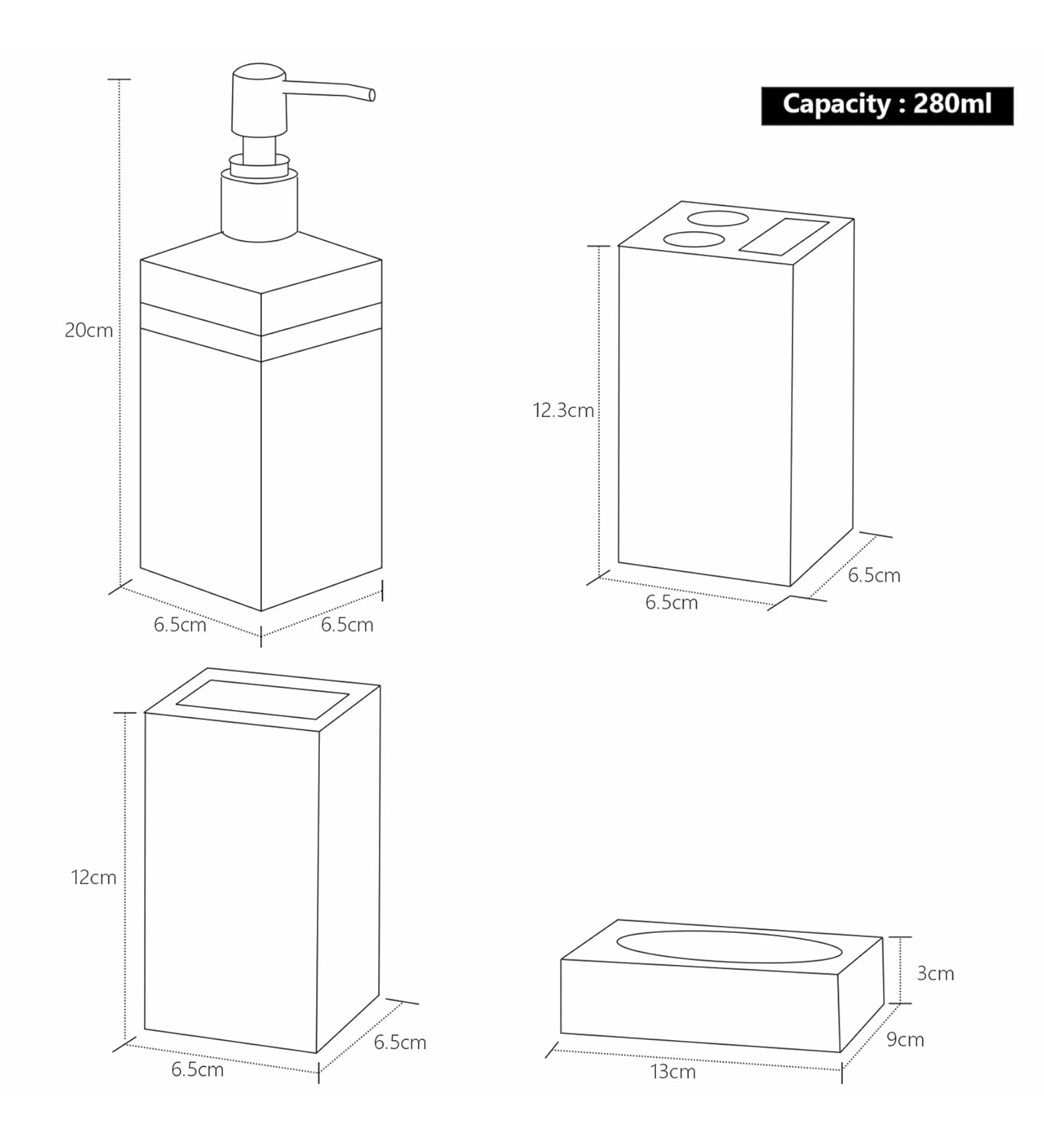 • DIMENSIONS IN CM: Soap Dispenser(L)6.5x(W)6.5x(H)20, Toothbrush Holder(L)6.5x(W)6.5x(H)12.3, Tumbler(L)6.5x(W)6.5x(H)12, Soap Dish(L)13x(W)9x(H)3
