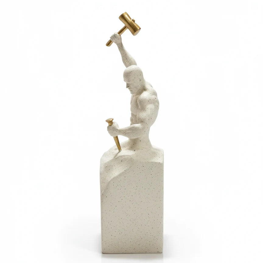 The Winner – Artisan Sculpture is a dramatic, motivational statement piece that celebrates creativity and self-creation. The sculpture depicts a figure in the process of carving himself from a rough stone block, wielding a metallic golden hammer and chisel. Rendered in a speckled off-white composite, the raw base contrasts with the finished form emerging from it. This artifact adds a compelling, symbolic element of ambition and transformation to a home office, desk, or creative studio.
